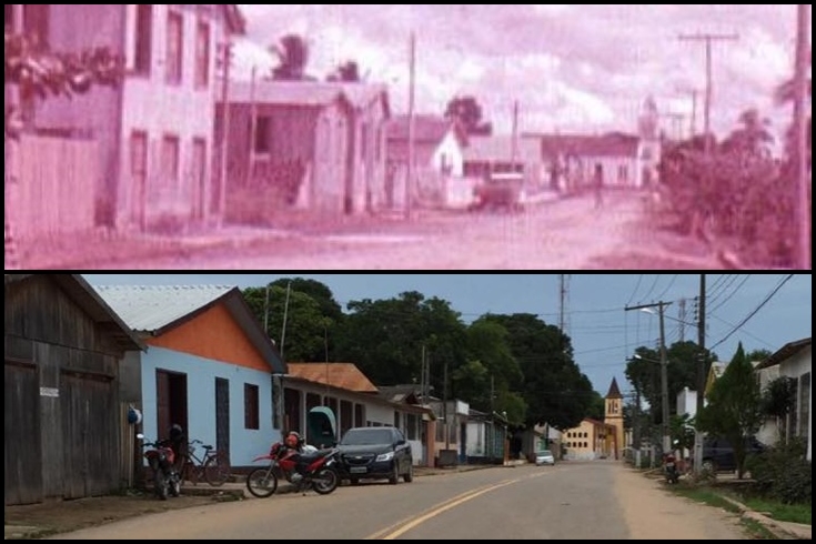Uma visão de quem saía do bairro Aristides em direção ao Centro da cidade. Muitas mudanças, o casarão de dois pisos azul com janelões marrons em madeira tinha cobertura de telha, não vivi essa época mas algumas construções me parecem muito bonitas, deveriam ter sido preservadas, muitos desses casarões em Tarauacá, Cruzeiro do Sul e, principalmente, Rio Branco, foram restaurados. Mais uma vez nossa única conexão entre o passado e o presente é a torre do sino na Igreja Matriz, absolutamente todo o resto mudou.